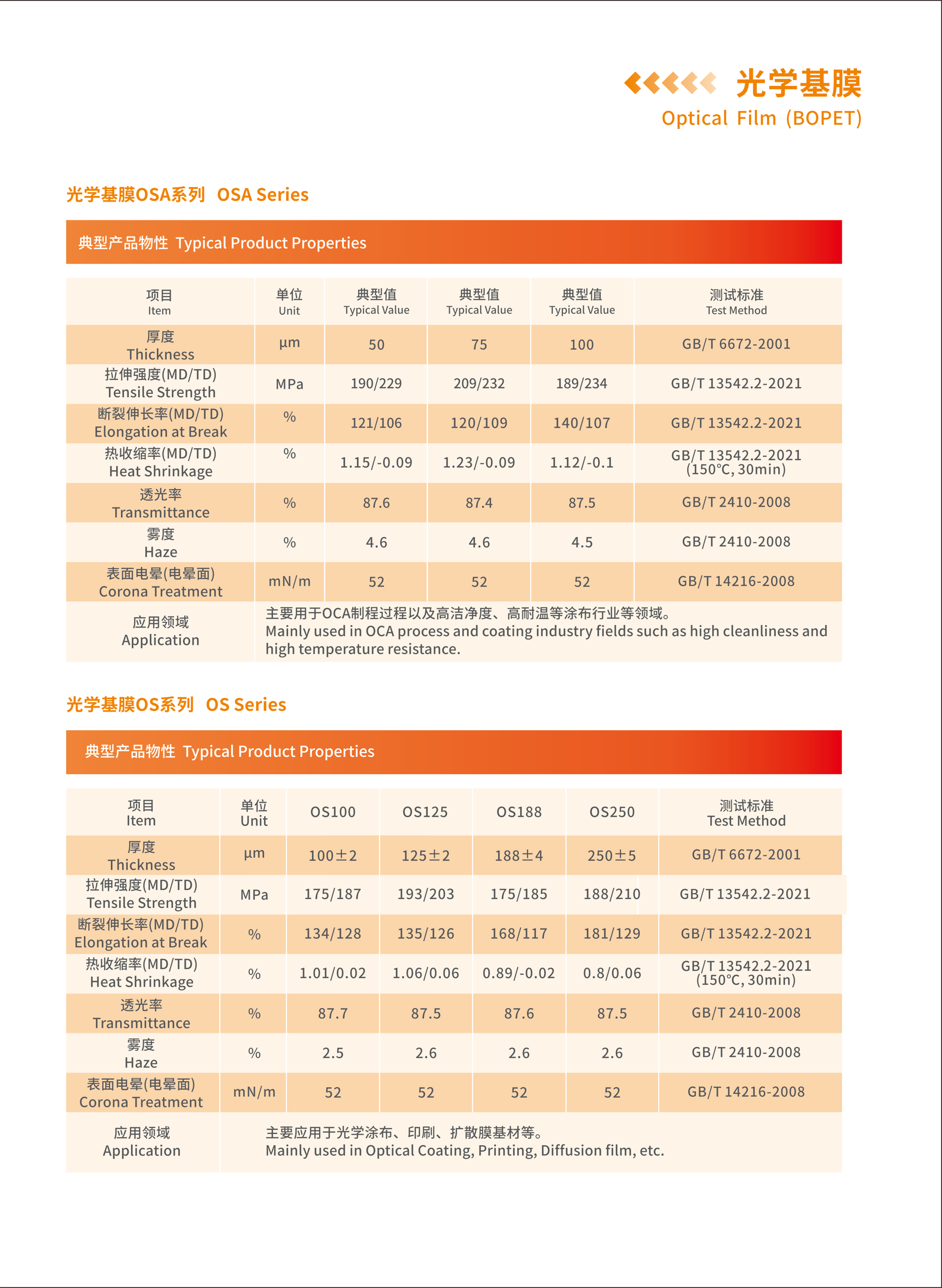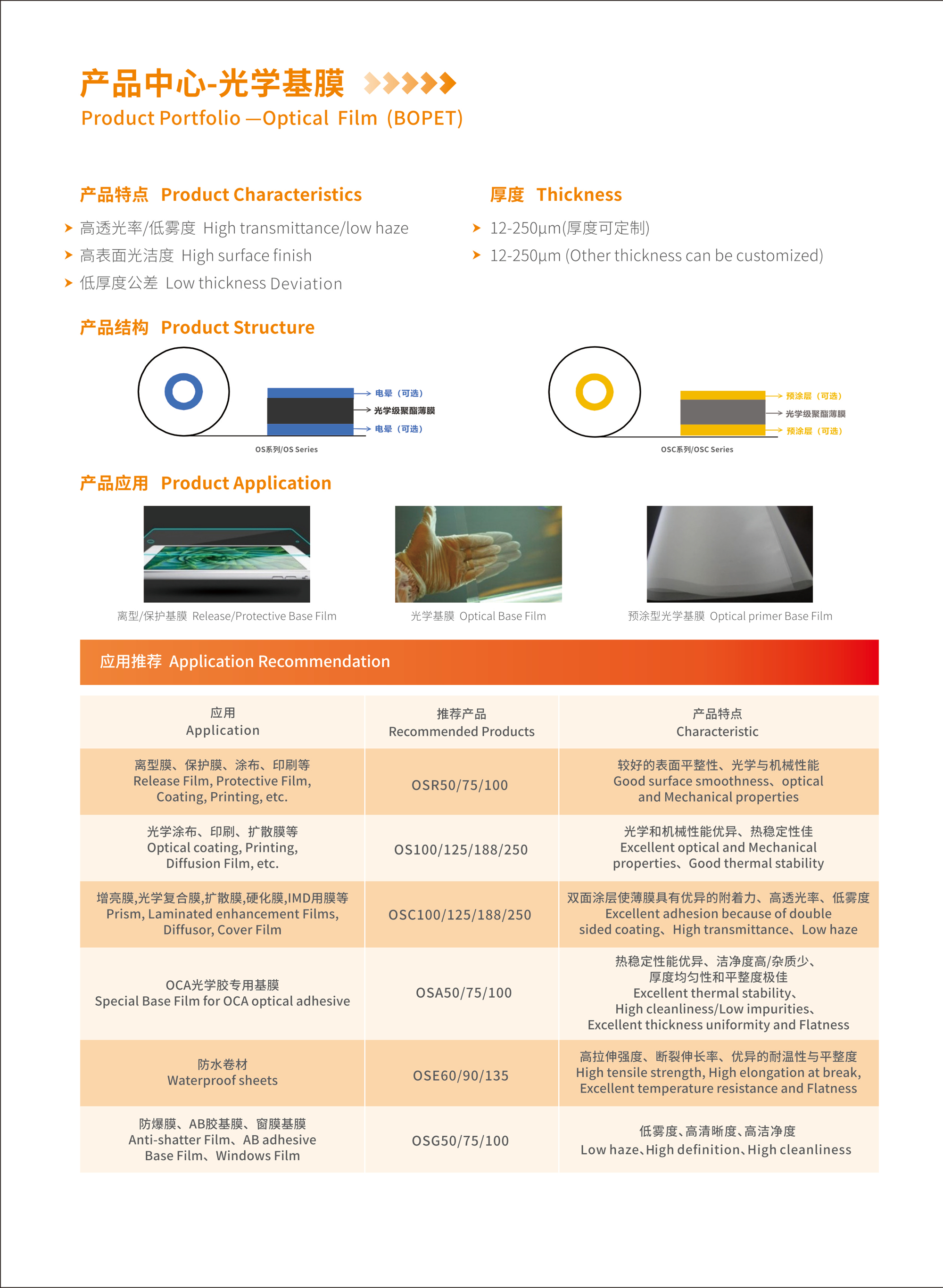 OSE系列:主要应用于防水卷材胎体膜、胶带膜等; OSG系列:主要应用于防爆膜、窗膜、AB胶基膜等;